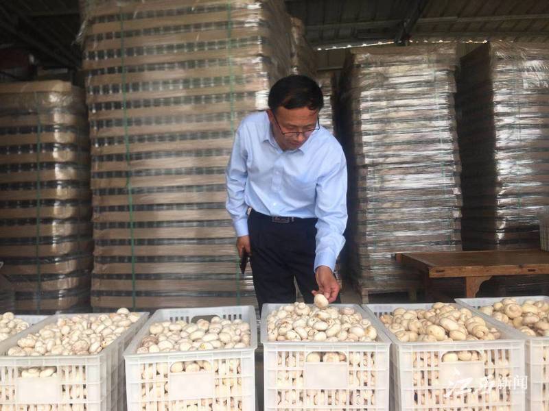 ▲ 中国建设银行乐安支行副行长陈升贵在双孢菇种植基地走访。摄影|记者孙沐雨