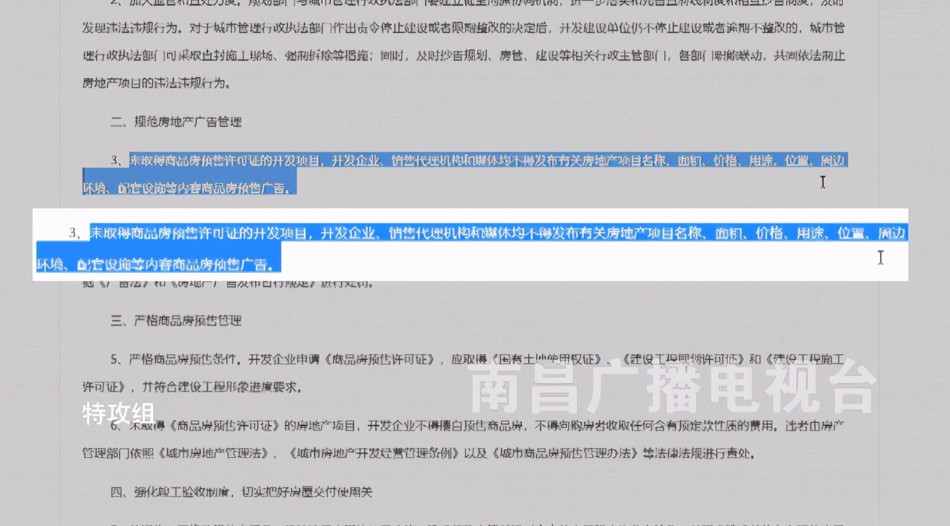 2008年,南昌市人民政府办公厅《关于进一步加强我市房地产市场监管工作的意见的通知》中就明确:未取得商品房预售许可证的开发项目,开发企业、销售代理机构和媒体均不得发布有关房地产项目名称、面积、价格、用途、位置、周边环境、配套设施等内容的商品房预售广告。