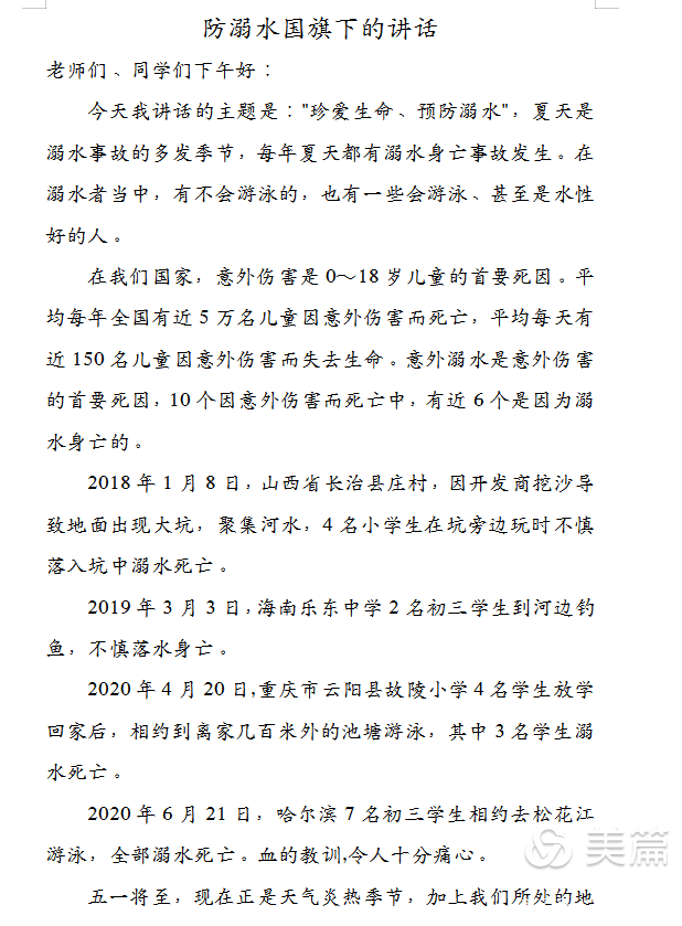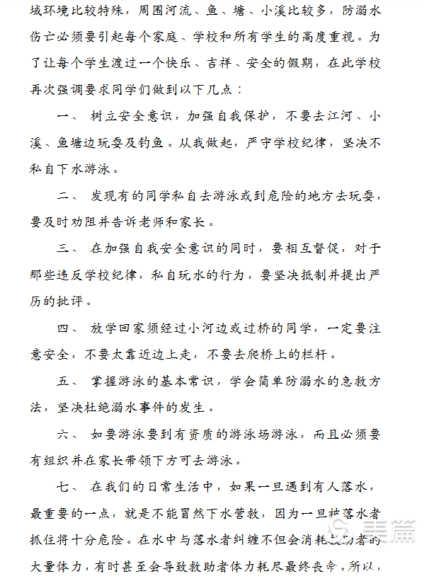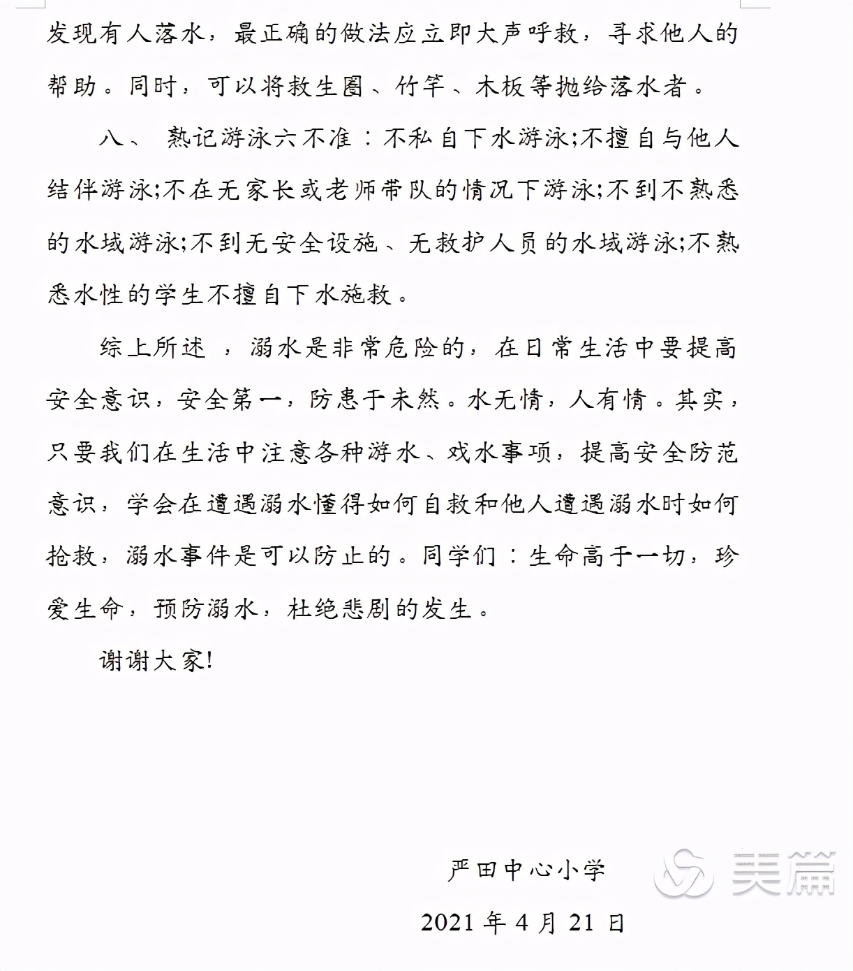 人生没有彩排,生命不会重来。请全体同学增强防溺水安全意识,提高自防自护能力。谨记:生命至上,安全第一!(严田中心小学供稿)