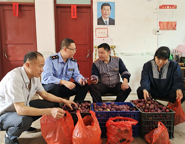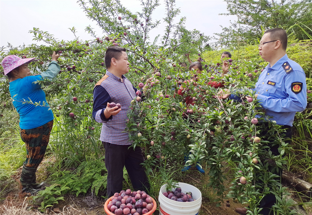 5月7日,江西省于都县市场监督管理局选派罗江乡黄坑村驻村第一书记马烨荣在该村杏香李种植基地同农户一起采收杏香李。