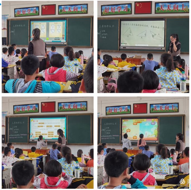 朱慧君老师带来的是四年级下册《三角形的认识》。她以猜谜语导入激发学生的兴趣,将整个课堂带入到一个轻松欢快的气氛中。 对三角形的高这个难点,朱老师通过由平行四边形的高迁移到三角形的高,再通过画不同底边相对应的高让学生学习高的认识, 并让学生自己动手画一画,做到了把课堂交还给学生。