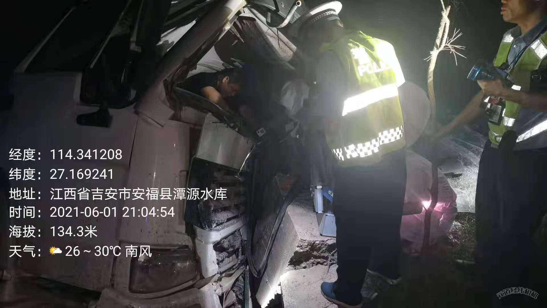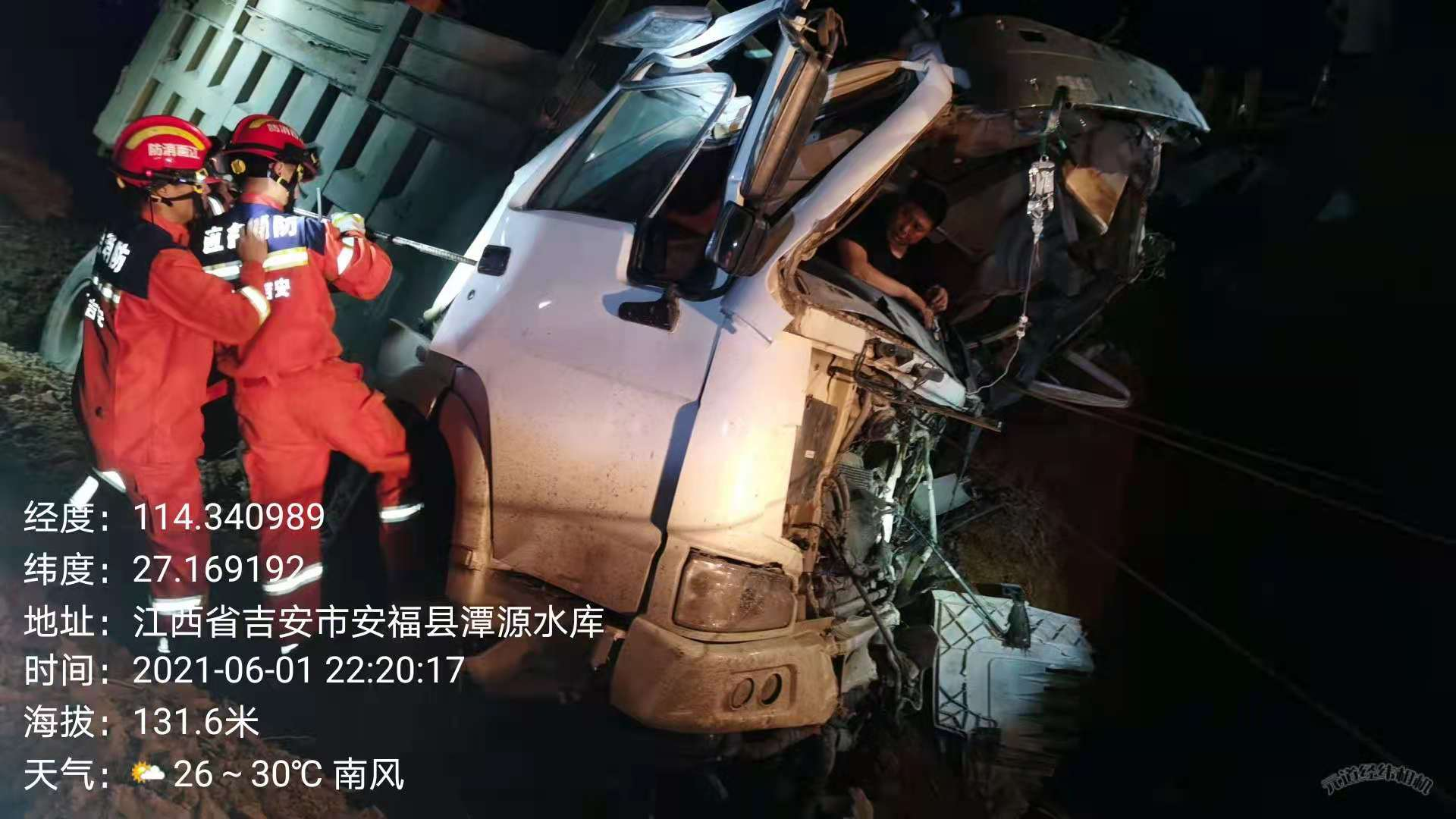 2021年6月1日晚上20时30分许,安福县公安局交警大队洲湖中队接到110指挥中心出警指令:洋门乡潭源水库路段发生一起单方事故,一辆大货车侧翻至道路外水沟里,驾驶员被卡在驾驶室受重伤无法动弹,要求迅速出警处置。