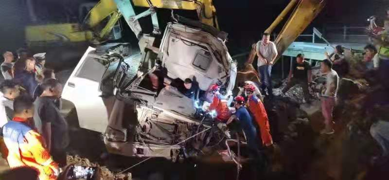 民警到达现场后,立即协调医护人员给驾驶员注射药品,以维持其体力。通过近一个小时的努力,终于指挥协调各部门将货车吊起,但由于驾驶室变形厉害,驾驶员下肢多处骨折,伤情严重,无法将其直接拖出驾驶室。一直到次日凌晨2时30分许,消防员将驾驶室解体后,才顺利将伤者解救,在现场等候的医护人员立即将其送往县人民医院进行治疗。当救援的人员离开现场时,村组干部、现场群众发自内心地连声道谢。