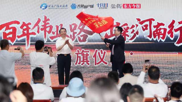 启动仪式上,驻马店市委常委、宣传部部长戚存杰为采访团授旗,河南广播电视台驻马店融媒体服务中心主任李鑫代表采访团接旗。