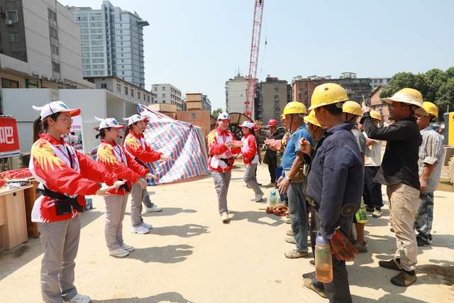 7月15日上午,南昌市轨道交通集团的小鲜鹭志愿者们来到中铁五局南昌地铁4号线丁公路北站,及时为奋战在一线的地铁参建工人送来丝丝清凉和暖暖心意。