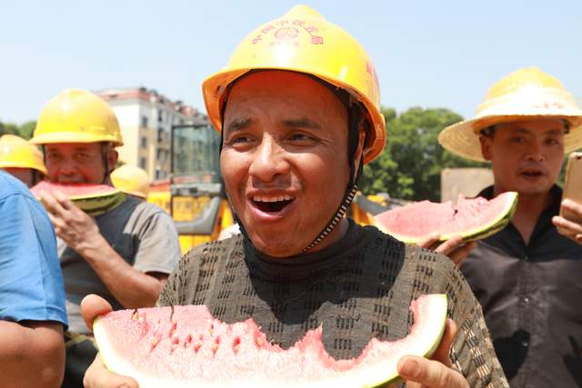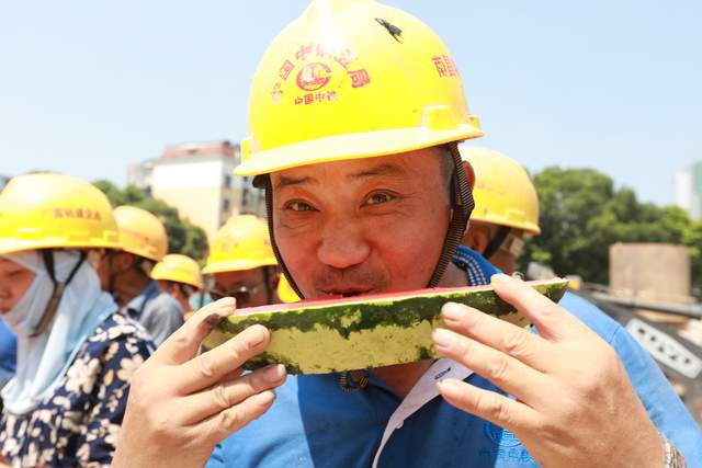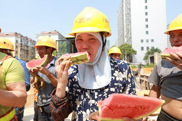 “这种高温天气,工地上不仅每天准备得有藿香正气水等防暑物资,还可以吃到甜美的西瓜,真的很开心。”工友蒋先飞边吃西瓜边说。