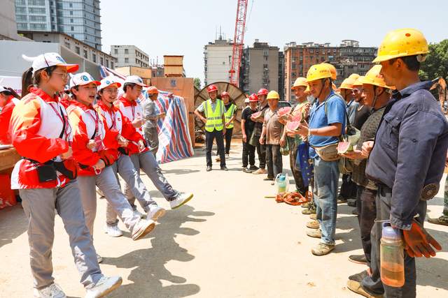 足蒸暑土气,背灼炎天光。溽热难耐的天气并没有影响中铁五局南昌地铁4号线项目部大干快干的气势,看到工地一线地铁建设者们挥汗如雨,战高温斗酷暑的场景,小鲜鹭志愿者们纷纷动容。