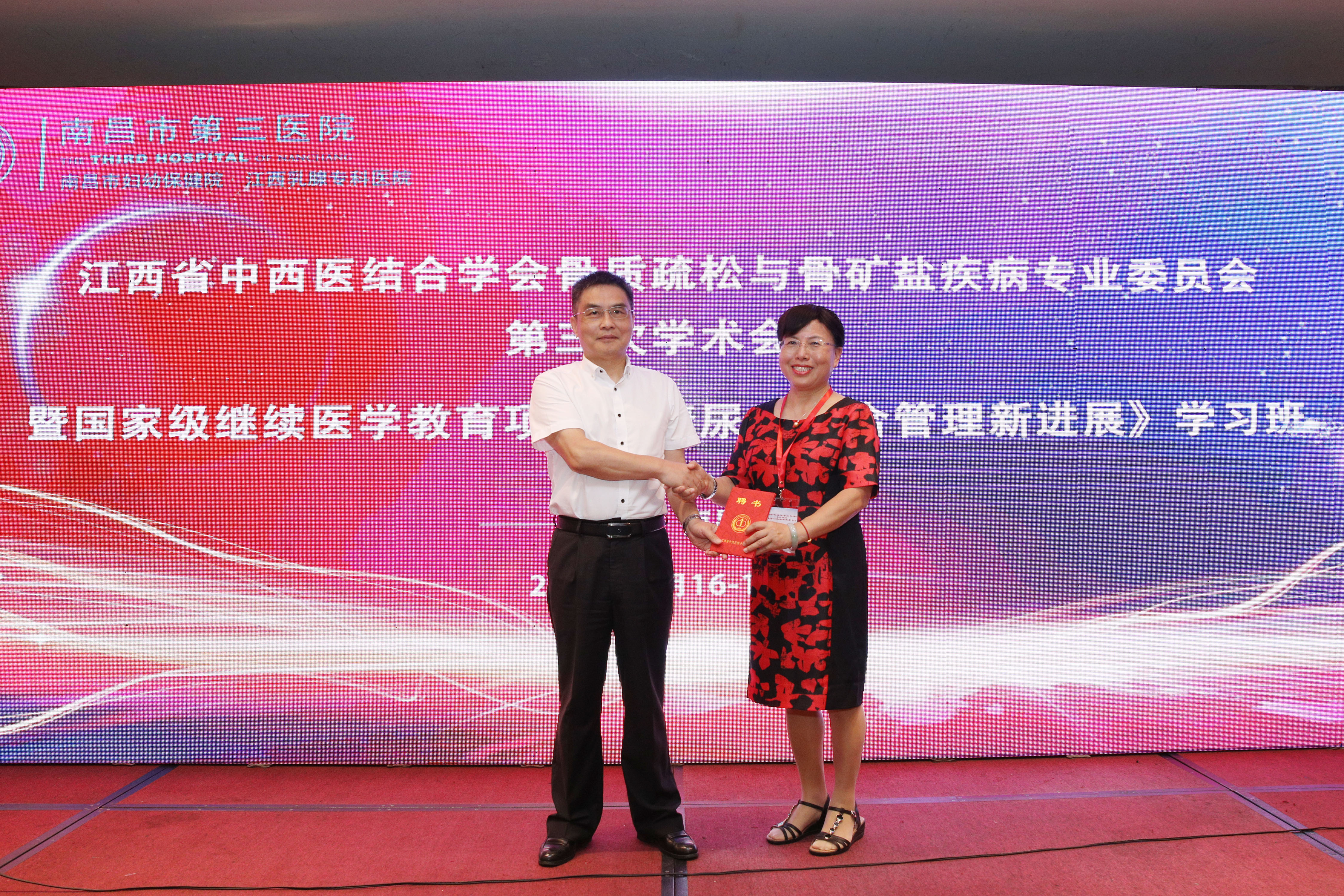 会议由涂萍教授主持,南昌市第三医院院长黄科棣致欢迎辞,江西省中西医结合学会副秘书长李才堂宣读江西省中西医结合骨质疏松与骨矿盐疾病专委会第二届主任委员、副主任委员、常委名单,江西省中西医结合学会会长李志刚为新当选主任委员涂萍教授颁发聘书并讲话。