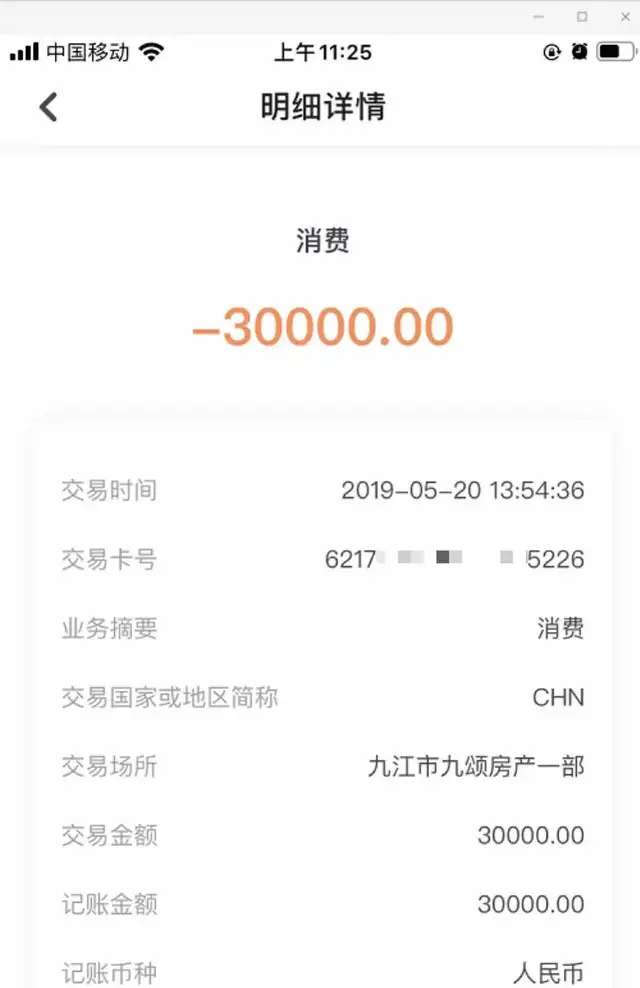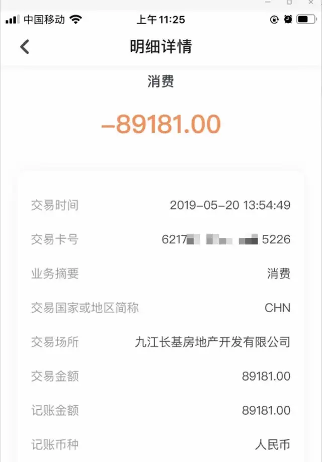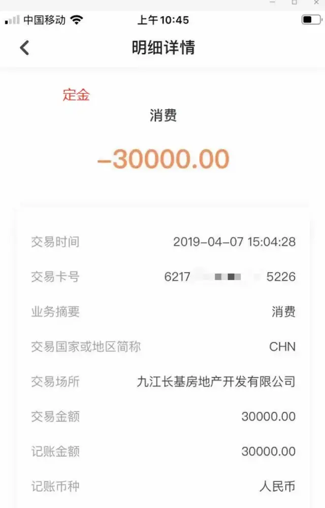 于是,吴先生查询了转账记录,显示2019年4月7日刷卡支付3万元到开发商九江长基房地产开发有限公司账上,次月20日又分别刷卡支付两次,一次支付了3万元到名为九江市九颂房产一部账号上,另一次支付89181元到开发商九江长基房地产开发有限公司账上。