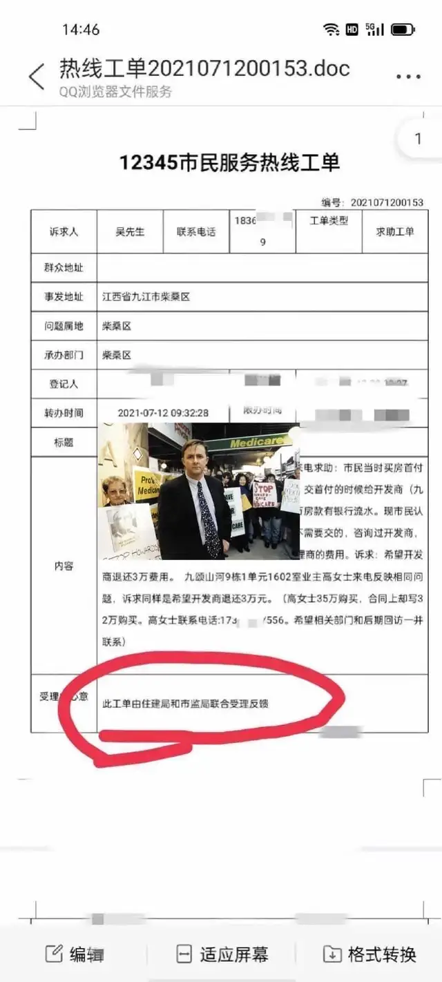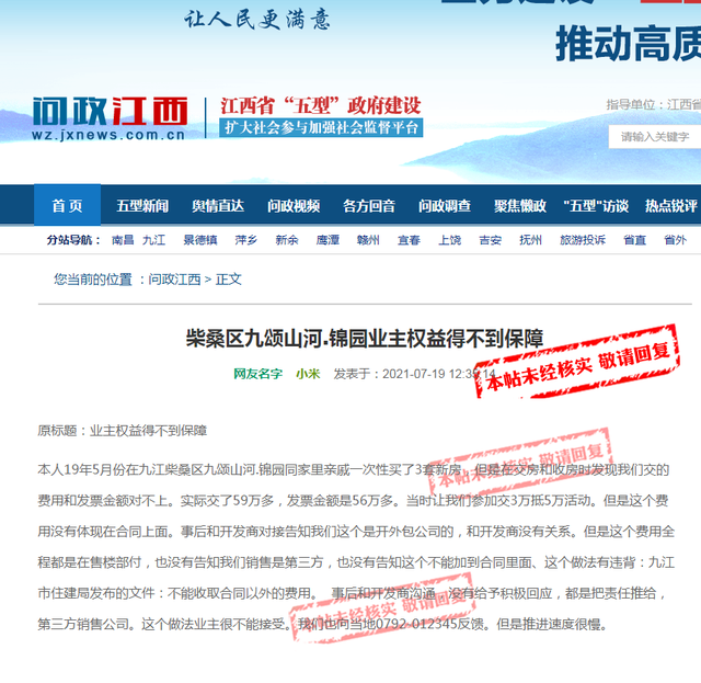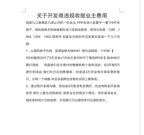吴先生说,根据九江市房管局文件,严禁收取任何合同约定外的其他费用,因此该开发商属于严重违规,为此他已经向多个部门进行反映和投诉,期待有一个公正合法的解决。