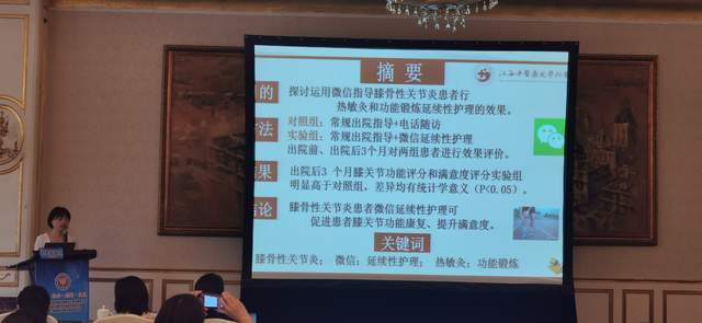 同时,7月24日下午,王智琴进行了本次大会优秀论文现场交流报告,本论文交流得到现场专家及学员的大力肯定,而且王智琴也是本次会议论文交流环节唯一的江西代表,她平时注重总结临床工作经验,论文《膝骨性关节炎患者微信延续性护理观察》也是其所主持的省卫健委课题总结。该论文有幸在全国上千篇论文中脱颖而出,进行现场大会发言,体现江西中医药大学附属医院护理工作实力所在,展现了江西中医药大学附属医院的风彩。