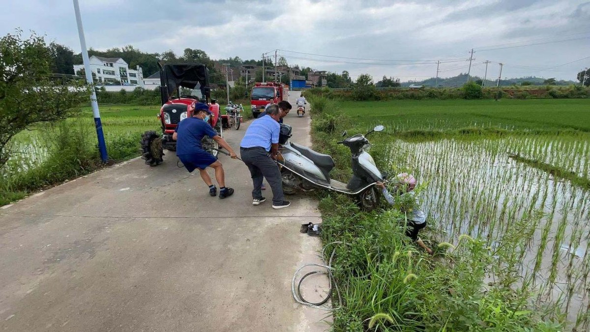 当日上午赣县区消防救援大队白鹭乡政府专职消防队在外出开展消防安全宣传广播工作途中,遇到村民骑摩托车不小心掉下田里,车辆无法扶至马路上。队员发现后立即下车询问村民是否受伤,在确认村民身体无碍后,队员使用绳索将摩托车从田里拉至马路上,事后村民表示非常感谢,称消防是及时雨。