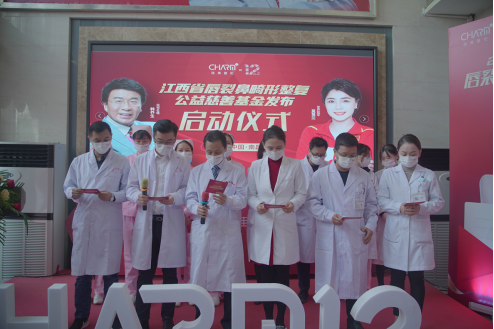 与会嘉宾们上台共同启动本次江西省唇裂鼻畸形整复公益慈善基金发布会,随着活动主题文字的缓缓上升,预示着本次活动圆满成功。