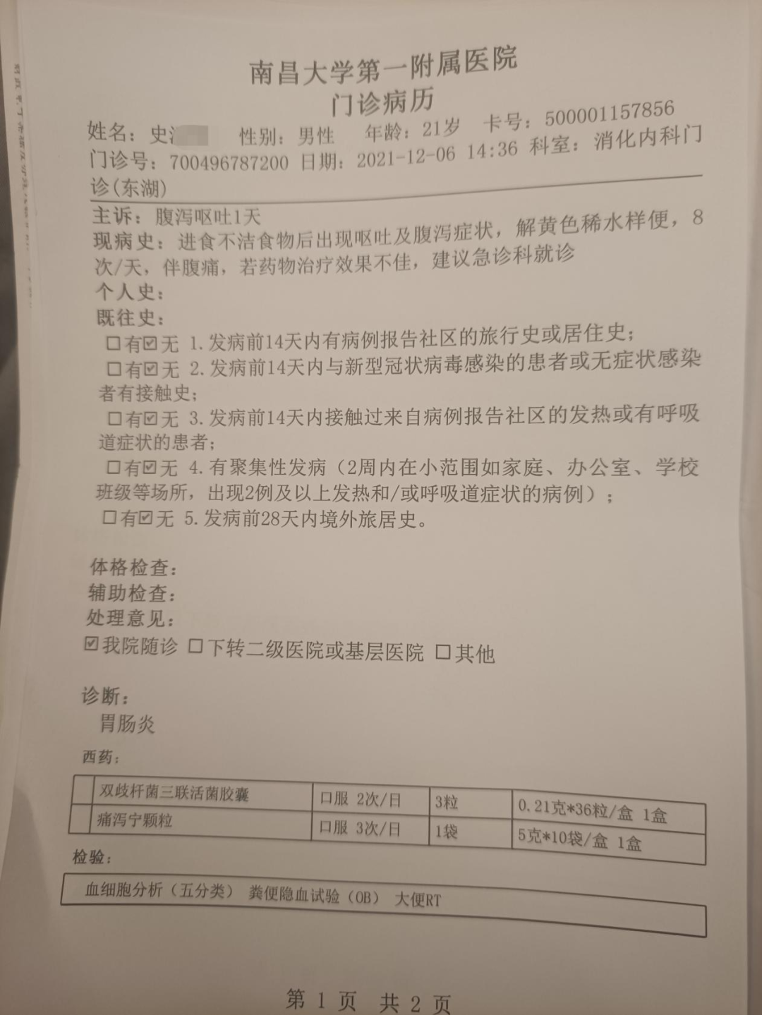 6日凌晨4时许,小史出现了呕吐腹泻的情况,但和他一同在海底捞用餐的朋友,因为没吃五花肉,所以没有出现身体不适的情况。因腹泻情况一直不见好转,6日下午,小史前往了南昌大学第一附属医院,经检验,小史粪便隐血,医生诊断为胃肠炎。